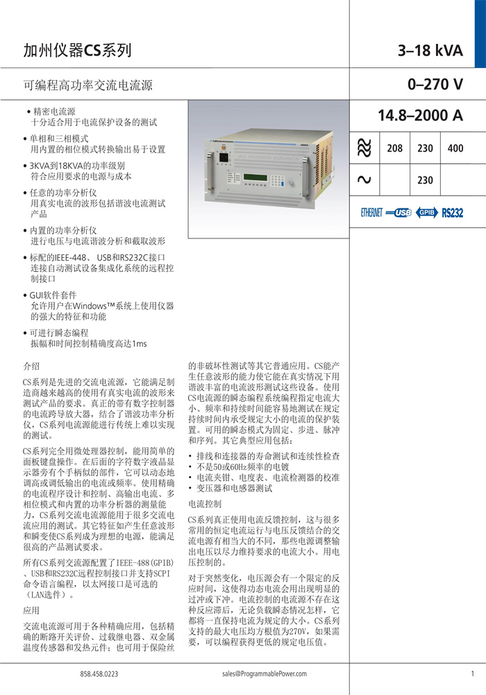 • 加州仪器CS系列可编程高功率交流电流源3–18 kVA