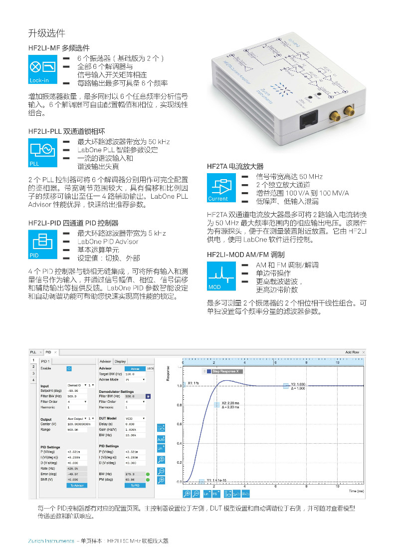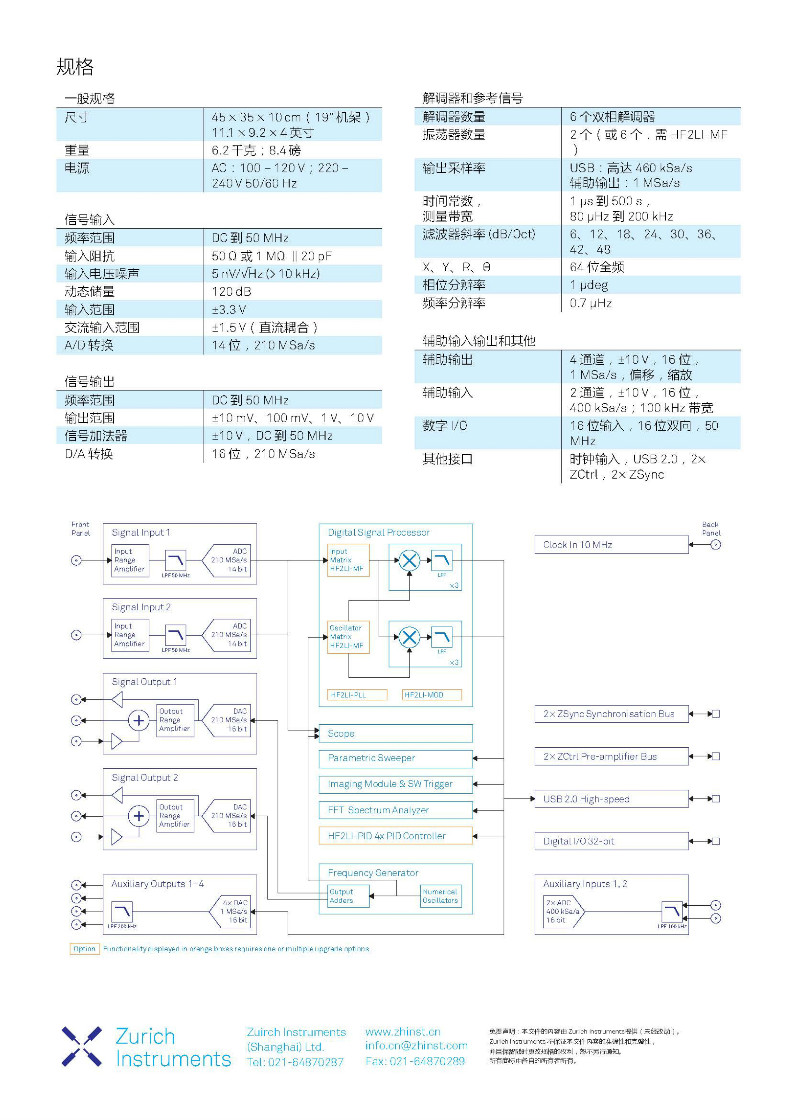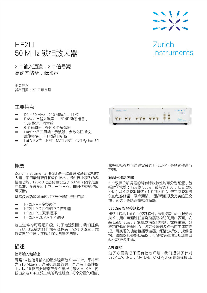 HF2LI 是一款高端数字锁相放大器,信号频率响应范围扩展至50MHz,拥有两个锁相单元,在测量系统中可代替两台常规锁相放大器;128位信号处理能力使锁相放大器实现了前所未有的卓越性能。HF2LI 是锁相放大器技术的一个里程碑,既支持现有各种应用,又能促进众多新应用的发展。