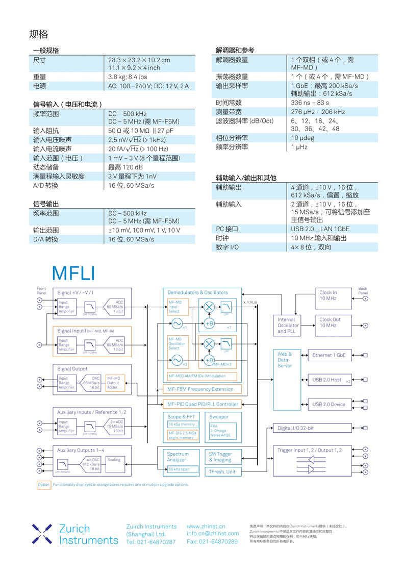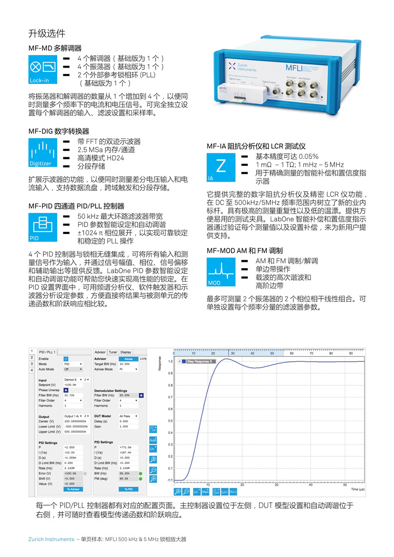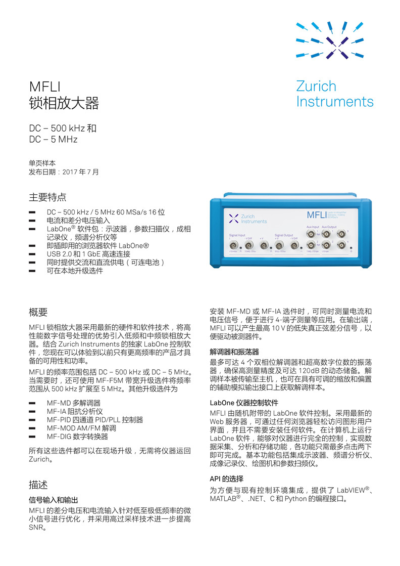 瑞士苏黎世仪器 (Zurich Instruments) 的 MFLI 是一款数字锁相放大器,为中频和低频范围的测量设定了新标杆。MFLI 提供两种版本,适用于“直流至 500 kHz”和“直流至 5 MHz”的频率范围(并可在有需要时从500kHz升级到5MHz)。凭借精心开发的模拟和数字前端,结合FPGA,使得仪器具有高速数字信号处理功能。 MFLI 将优越的性能与出色的LabOne® 软件包融合到了一起。嵌入式数据和网络服务器可直接连接至任何能够运行网络浏览器的设备。