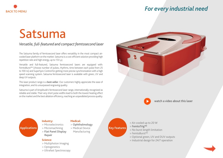 功能和全功能,萨摩飞秒激光器配备:FemtoBurst(从25到100 ns选择脉冲数、节奏、每个脉冲之间的时间)和SuperSync控制,以获得与高速扫描系统更精确的同步。萨摩飞秒激光器可提供绿色、紫外线和深紫外线输出。
