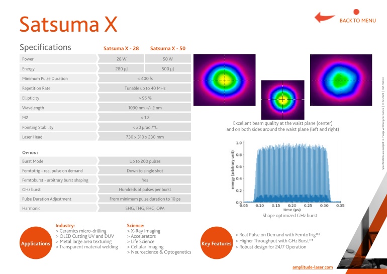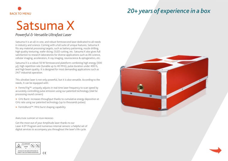 SatsumaX是一款功能齐全、功能强大的飞秒激光器,可满足工业和科学领域的所有需求。SatsumaX拥有一整套独特的功能,适合任何材料加工目标,如电池图案,喷嘴钻孔,高质量纹理,芯片切割,OLED切割等。SatsumaX还为生命科学、细胞成像、加速器、X射线成像、神经科学和光遗传学等各种应用的研究实验室提供了充分的满足。