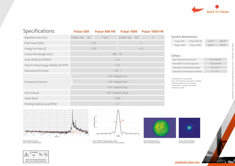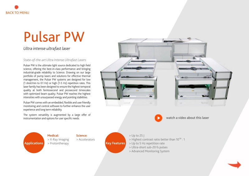Pulsar PW是专用于高场科学的终极光源,提供一流的性能,并为科学领域带来工业级的可靠性。利用我们丰富的泵浦激光器产品组合和有效热管理解决方案,PulsarPW系统专为低功率(1次/分钟至0.1Hz)或低功率(0.1Hz)激光器而设计。高(1-5赫兹)重复频率。该激光器系列旨在确保飞秒和皮秒时间尺度的最高时间质量,并优化光束质量。脉冲星PW以无与伦比的能量和指向稳定性达到最高强度