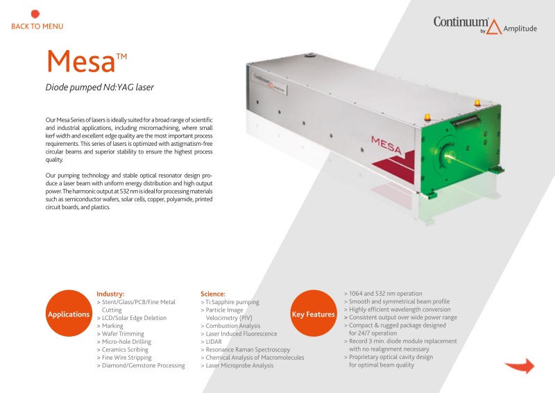 Mesa系列激光器非常适合广泛的科学和工业应用,包括微加工,其中小切口宽度和优异的边缘质量是最重要的工艺要求。该系列激光器经过优化,具有无像散的圆形光束和卓越的稳定性,以确保最高的加工质量。