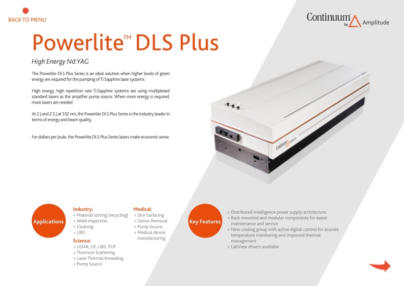 当钛宝石激光系统的泵浦需要更高水平的绿色能源时,PowerliteDLS Plus系列是理想的解决方案。