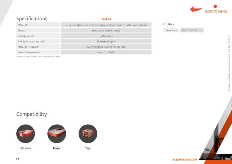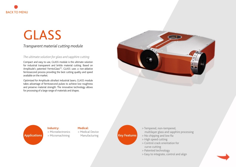 GLASS模块结构紧凑,易于使用,是工业透明和脆性材料切割的终极解决方案。基于振幅的专利的FemtoGlassTM,玻璃使用非烧蚀飞秒工艺提供最佳的切割质量和市场上提供的速度。